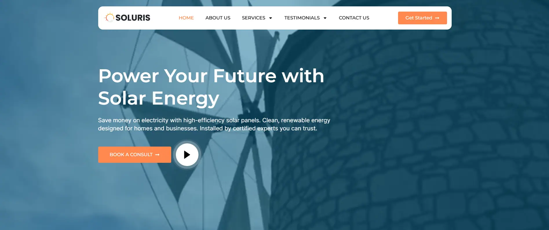 A clean and informative website promoting solar energy solutions and renewable power services.